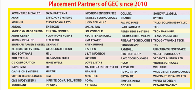 GEC being one of the best collges in terms of placements and employability, has always been a highly sought after dream institution for students and parents across length and breadth of the country. Since its inception, School of Career Advancement has proven its mettle by providing above 90% record placements since last 8 years in different premier organizations and industries of both national and international repute. School of Career Advancement focusses purely on generating training opportunities, organizing various campus placements and internship opportunities by liasoning with industries, counseling students for bringing clarity of their career objectives and goals and also nuture them for enhancing their personality. The School also focusses on making students ready for various elite competitive examinations like IES, IAS, GATE, OAS etc.